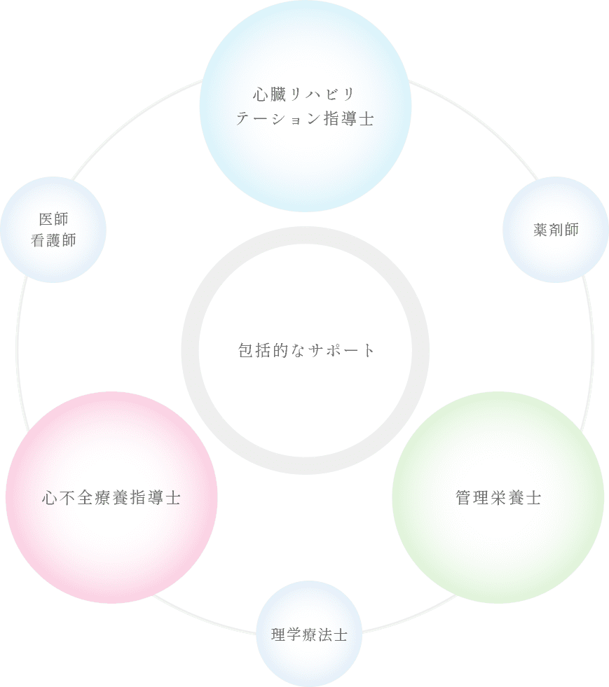 医師・薬剤師・管理栄養士・理学療法士・健康運動指導士・看護師などの多職種が連携し、運動療法や食事療法を含めた包括的なサポートを行います。